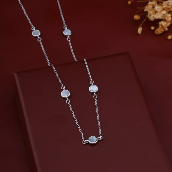 This elegant necklace is crafted from 925 sterling silver, featuring a delicate and modern design. The fine, polished chain is interspersed with multiple, round-shaped stations.