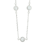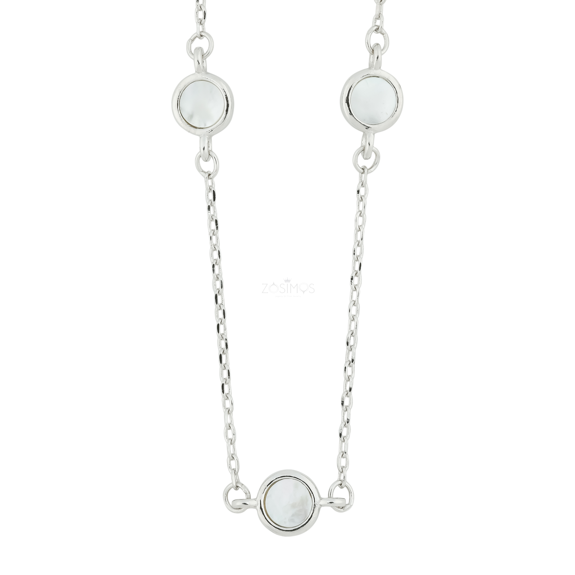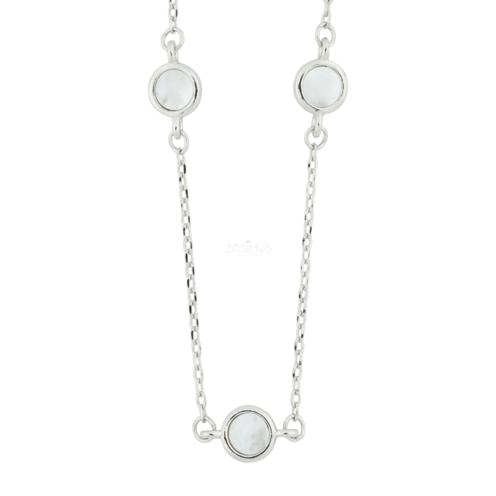 Each station holds a smooth, circular mother of pearl inlay, which has a beautiful, iridescent sheen that catches the light with a soft glow. The stones are expertly set in a simple yet secure bezel setting, creating a clean and continuous look along the chain.