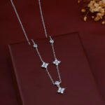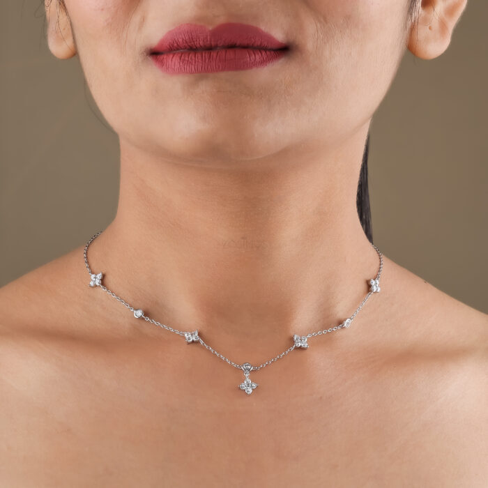 The careful arrangement of the stones and the clover motifs creates a harmonious and sophisticated look. This necklace is a versatile accessory, perfect for adding a touch of sparkle and modern style to any outfit.