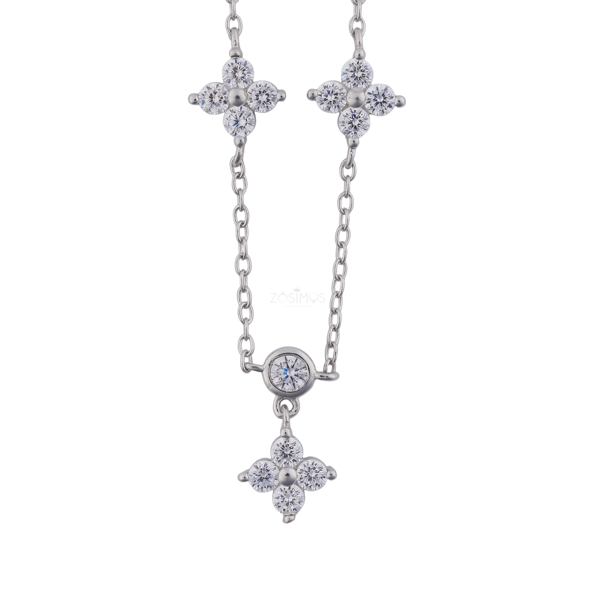 The necklace showcases a series of sparkling elements. The main chain has two decorative stations, each featuring a four-leaf clover design made of brilliant cubic zirconia stones. A central drop hangs from the main chain, leading to a small, single cubic zirconia stone in a polished bezel setting. Below this, another clover-shaped drop is suspended, mirroring the design of the stations.