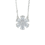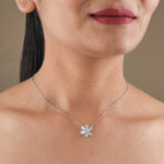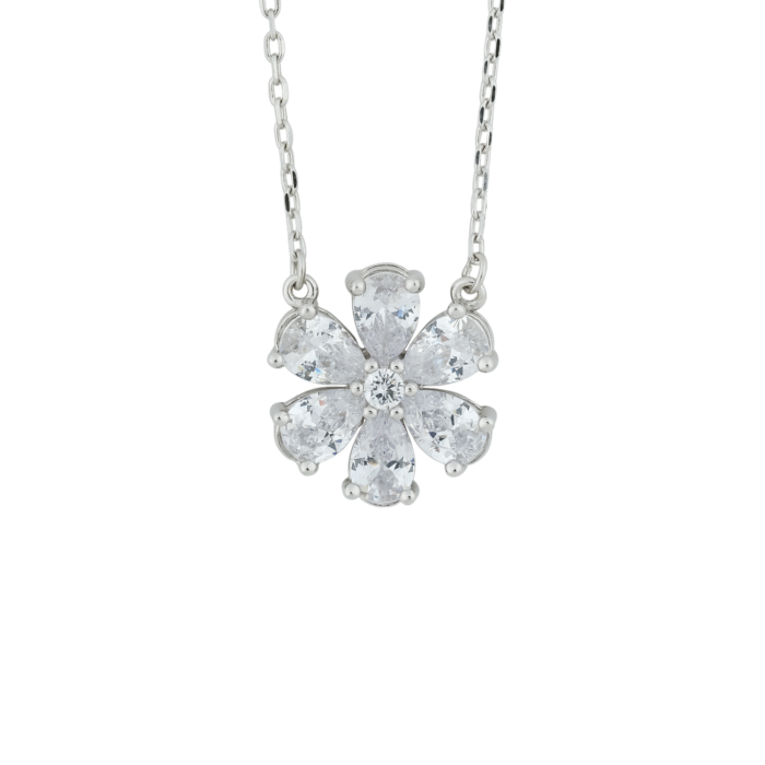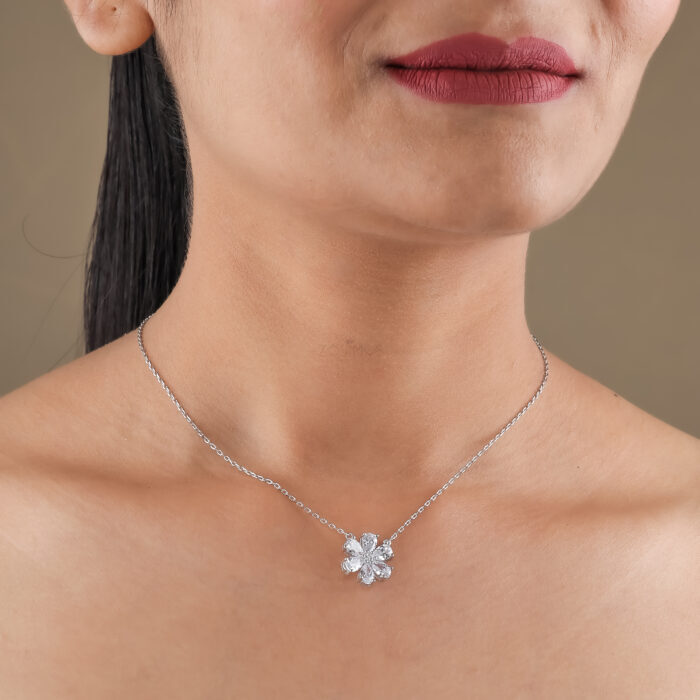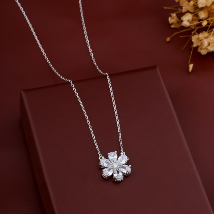 The pendant is suspended from the chain by a small loop on each side, ensuring the flower lays perfectly flat and centered when worn. This necklace is a perfect accessory for adding a touch of floral charm and brilliant sparkle to any outfit, making it ideal for special occasions or as a thoughtful gift.