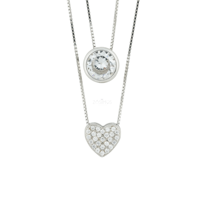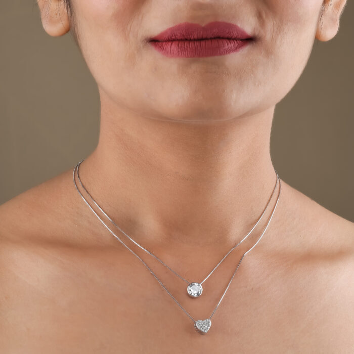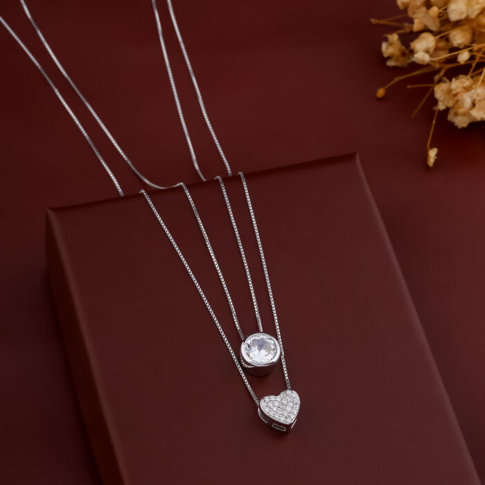 Home 925 Silver Necklaces & Pendants 925 Sterling Silver Cubic Zirconia Heart and Solitaire Double Layer Necklace