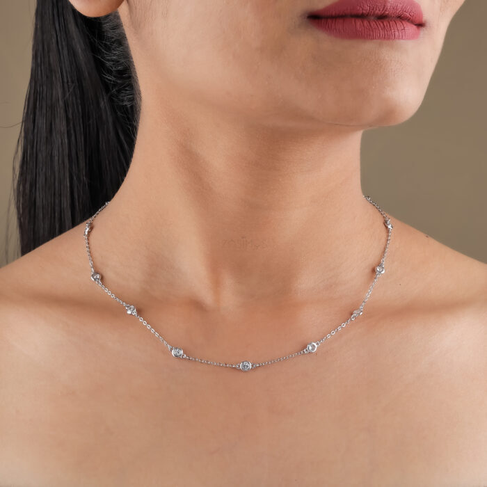 Each stone is expertly set in a simple yet secure bezel setting, which encases the stone and gives it a clean, continuous look. The bezel setting allows the stones to be integrated directly into the chain, creating a harmonious and sophisticated flow. The stones are positioned at intervals along the chain, adding a perfect amount of sparkle.
