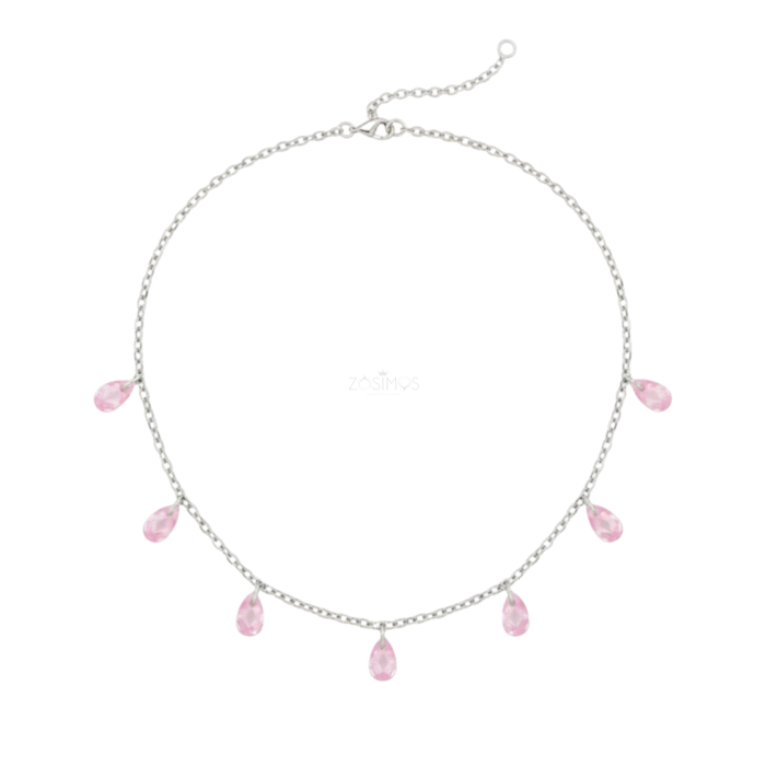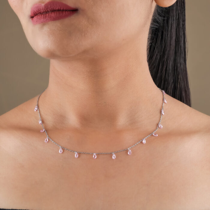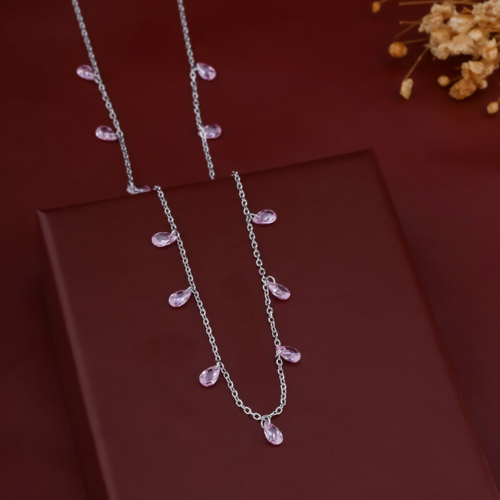 Brighten up your look with this delicate and charming 925 sterling silver necklace, adorned with faceted pink teardrop charms. Each soft pink charm dangles gracefully from the polished silver chain, adding movement, color, and a touch of whimsy to your everyday or special-occasion outfit.