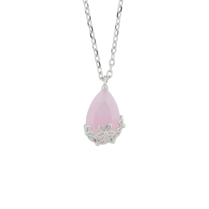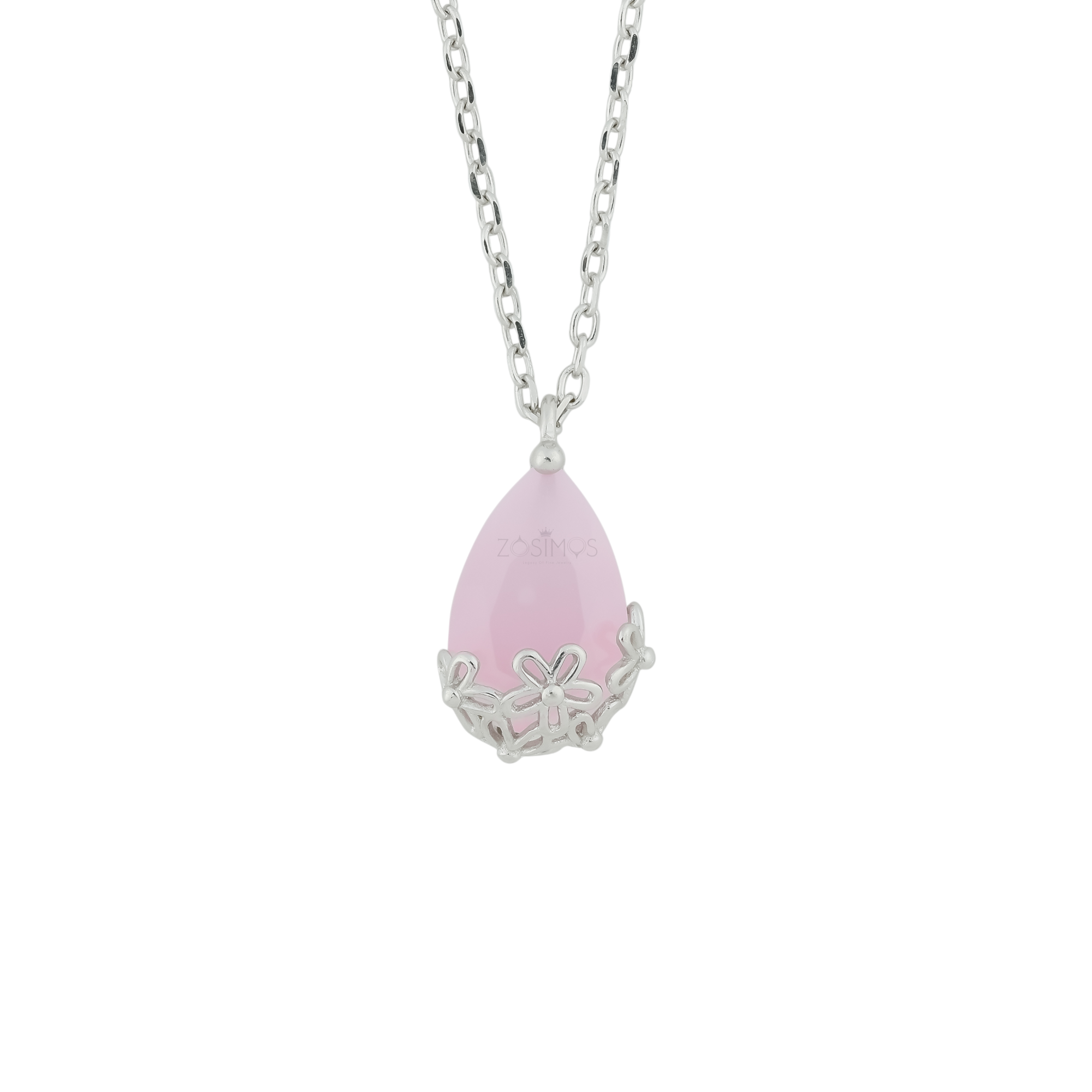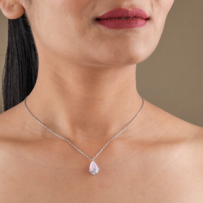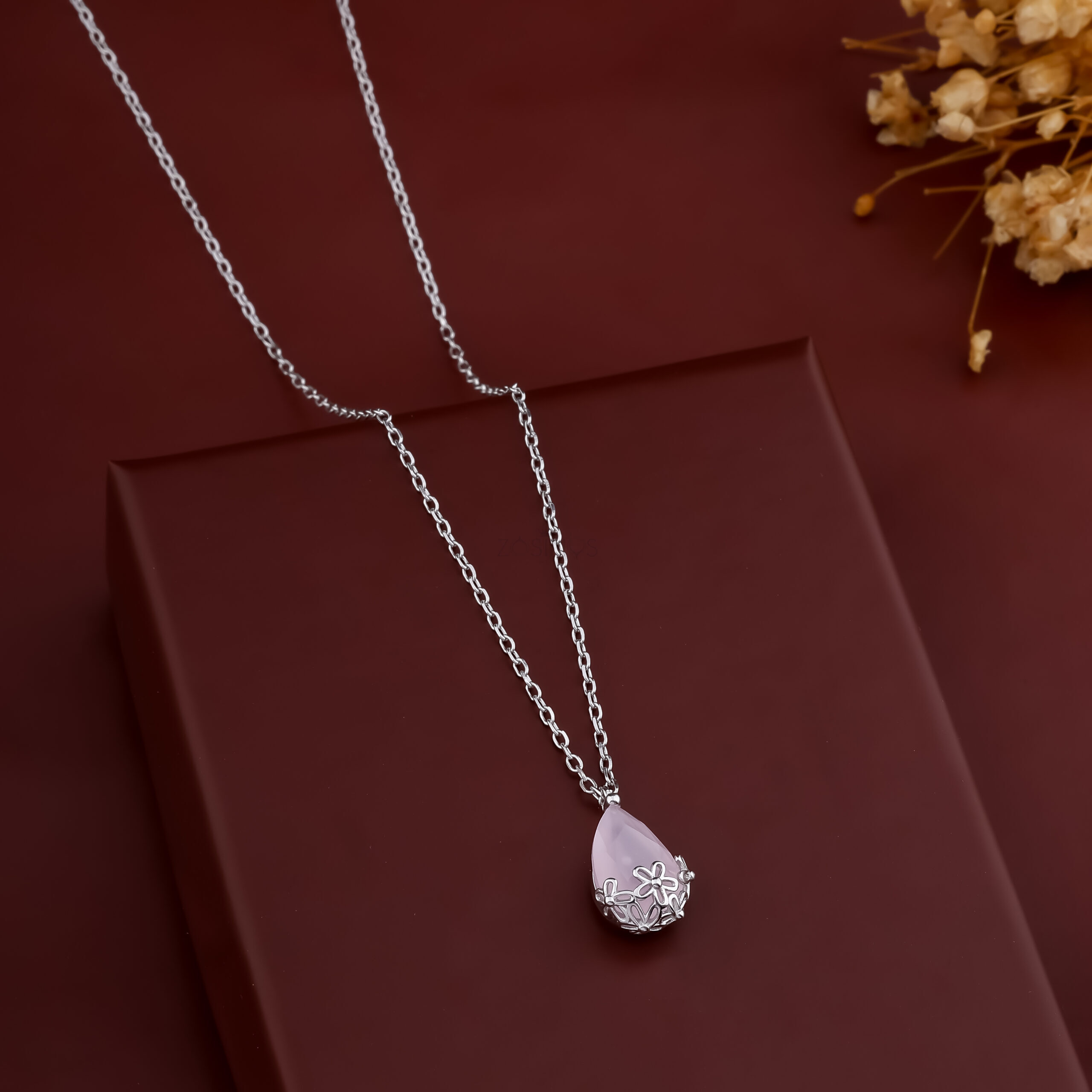 This beautiful necklace is crafted from 925 sterling silver, featuring a fine, polished chain. The centerpiece is a striking teardrop-shaped pendant with a smooth, translucent pink gemstone. The stone’s soft, blush hue provides a delicate and elegant look.