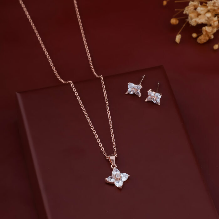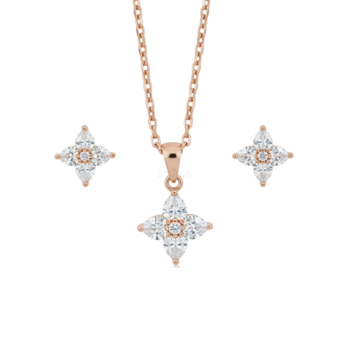 This elegant jewelry set is crafted from high-quality 925 sterling silver and finished with a fashionable rose gold plating. The set includes a matching necklace and a pair of stud earrings. Both the necklace pendant and the earrings feature a beautiful four-leaf flower design, with each petal made from a sparkling, Heart-shaped cubic zirconia stone. A central, round-cut cubic zirconia stone adds a brilliant focal point. The delicate rose gold chain and the classic stud earring design make this a perfect set for adding a coordinated and sophisticated touch to any look.