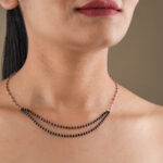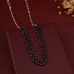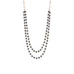 The chains are adorned with numerous small, polished black beads. These beads are spaced along the rose gold chain, giving the necklace a “rosary” or “station” style. The contrast between the warm, metallic shine of the rose gold and the deep, matte black of the beads is striking and modern.