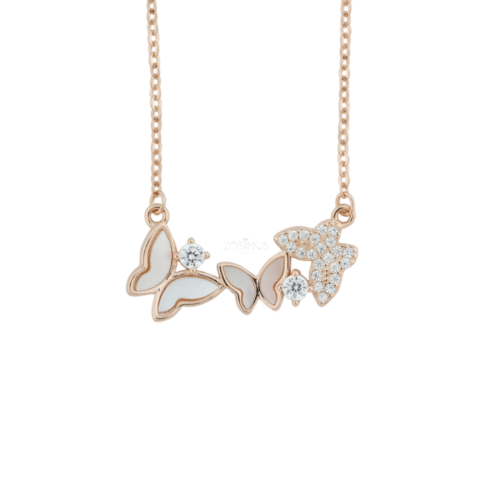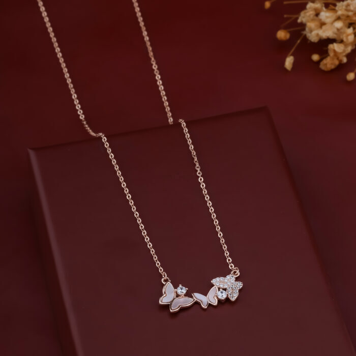 This charming necklace is made from high-quality 925 sterling silver and is beautifully plated in a warm rose gold finish. The centerpiece of the necklace is a delicate trio of butterflies, designed to represent grace and transformation.