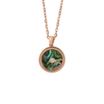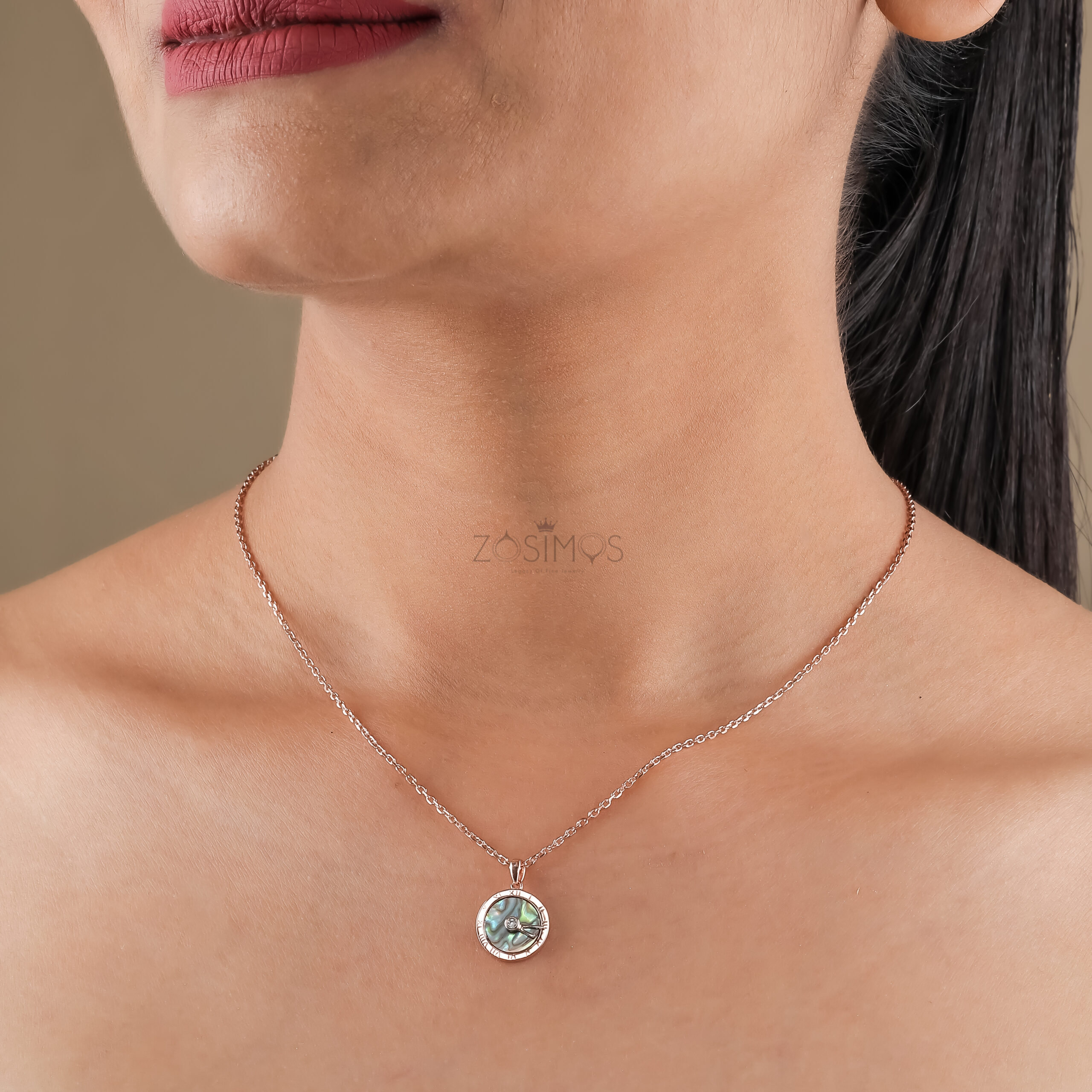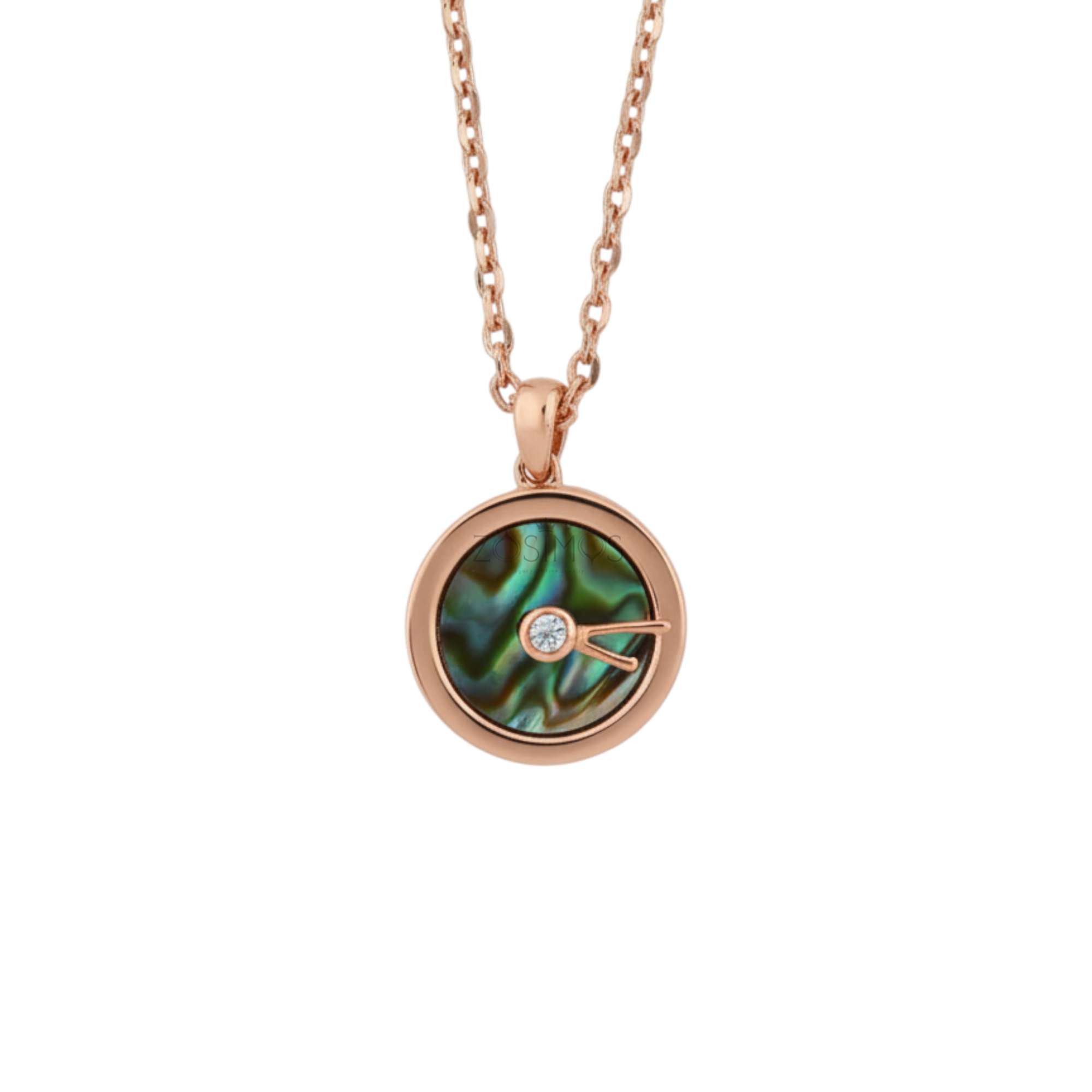 The pendant’s face is a beautiful, iridescent mother of pearl inlay, which shimmers with deep green, blue, and purple tones, reminiscent of an abalone shell. Overlaid on the mother of pearl is a cubic zirconia stone, set in a delicate rose gold “pointer” or “needle” design. The outer ring of the pendant is engraved with roman numerals, adding to the classic compass theme.