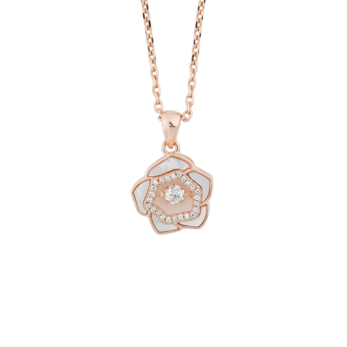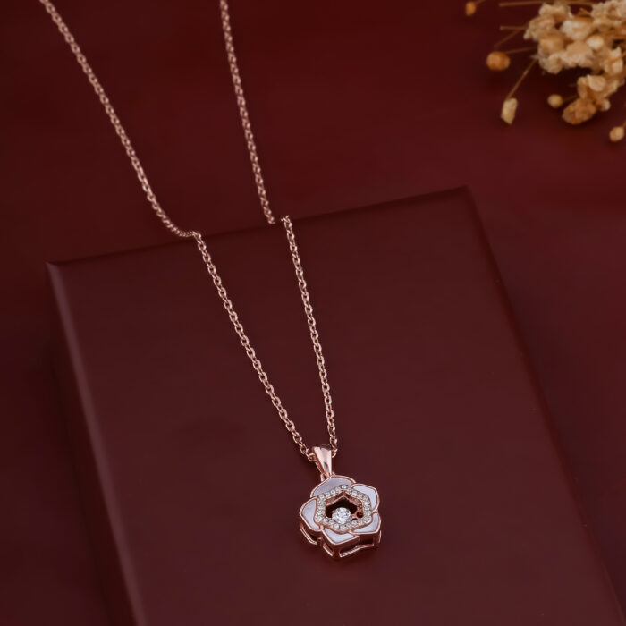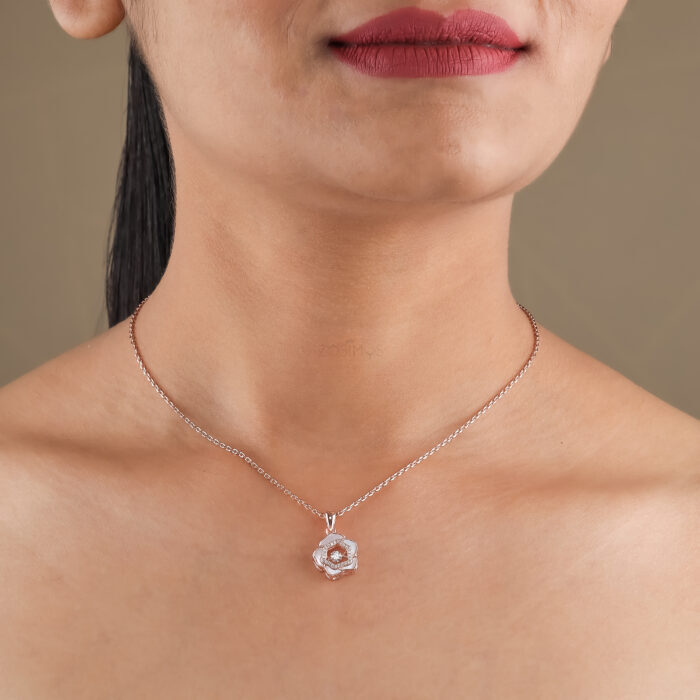 This exquisite necklace is crafted from 925 sterling silver and finished with a lovely rose gold plating, giving it a warm, romantic hue. The centerpiece is a stunning floral pendant, meticulously designed to resemble a blooming rose.