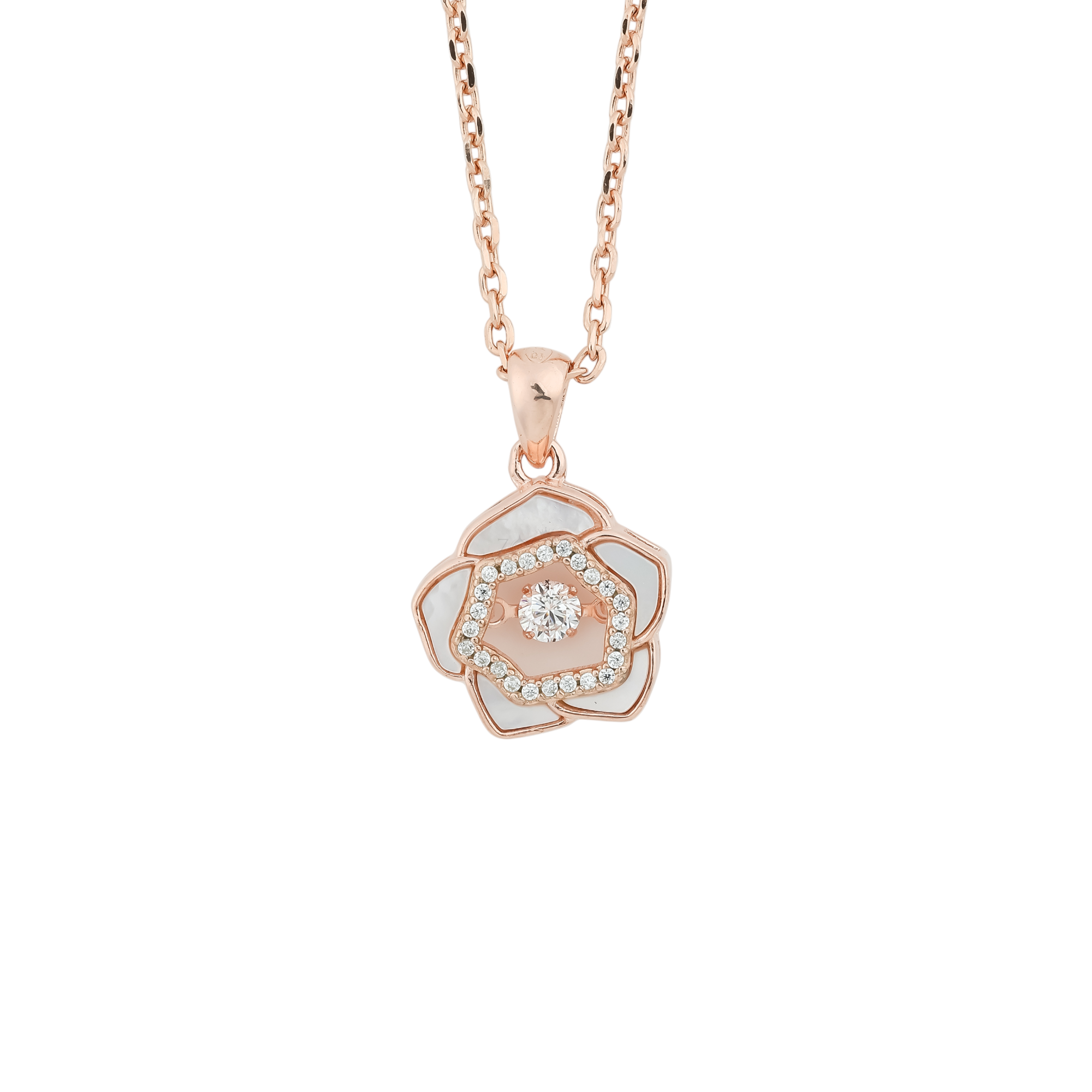The petals of the rose are created from smooth, polished mother of pearl, which has a beautiful, soft white to pinkish sheen that gives the flower a lifelike, delicate appearance. The center of the flower is a brilliant cluster of sparkling cubic zirconia stones, which are arranged to form a dazzling focal point. A smaller, raised rose gold frame surrounds the cubic zirconia, adding depth and detail.