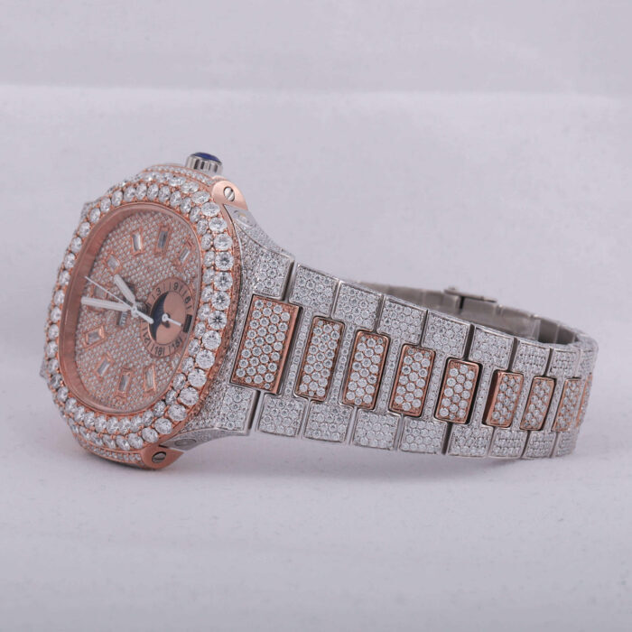 Elevate your style with the ultimate statement of sophistication and brilliance. This luxury timepiece is meticulously crafted and encrusted with premium moissanite gemstones, renowned for their dazzling fire and diamond-like sparkle. Each stone is hand-set to ensure maximum radiance, creating a watch that captures attention from every angle.