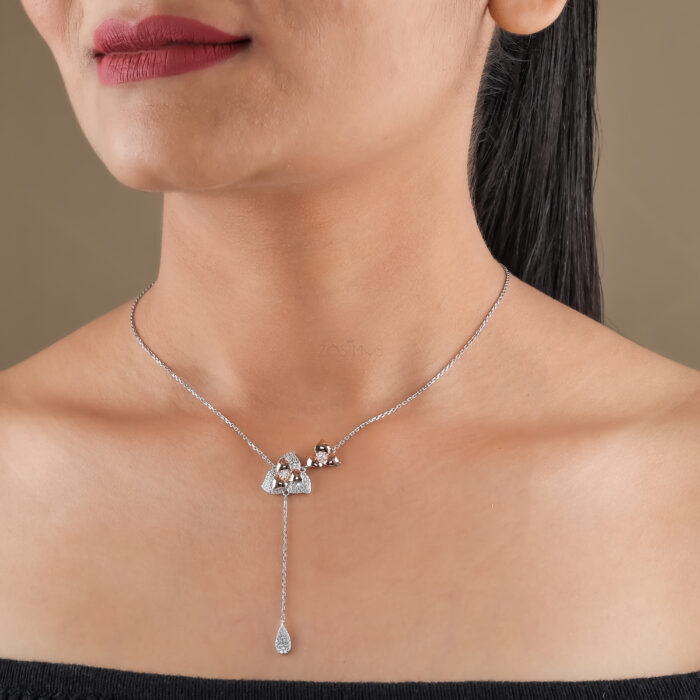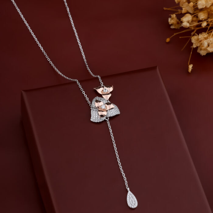 Add a touch of refined elegance to your jewelry collection with this exquisite 925 sterling silver lariat necklace, featuring a stunning dual-flower design. Each flower is crafted with a blend of rose gold-plated petals and sparkling cubic zirconia stones, beautifully arranged to form a soft floral silhouette.