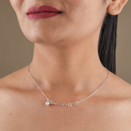 Perfect for formal occasions or a romantic gift, this necklace is designed to sit delicately along the neckline, offering a sophisticated and feminine touch to any outfit.