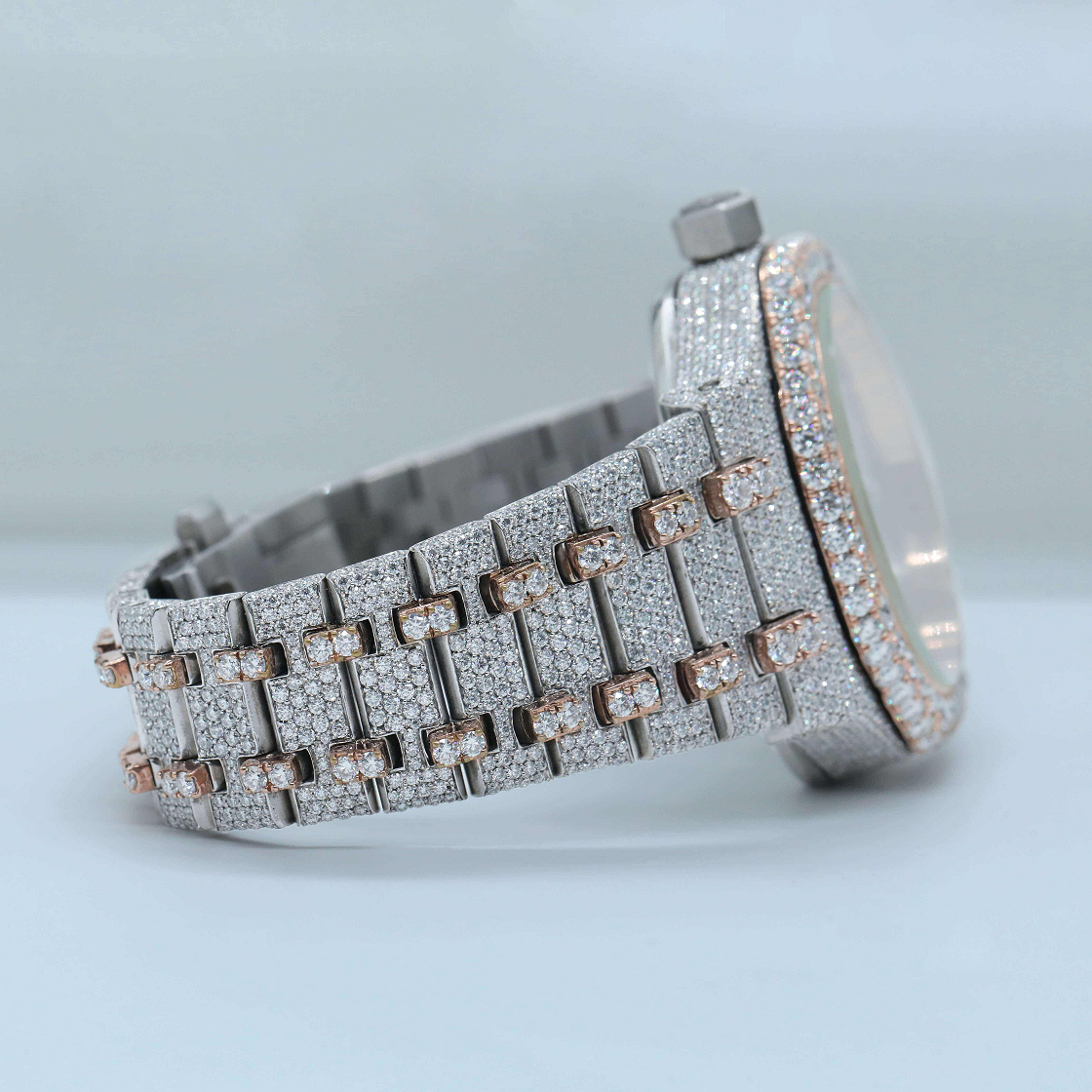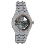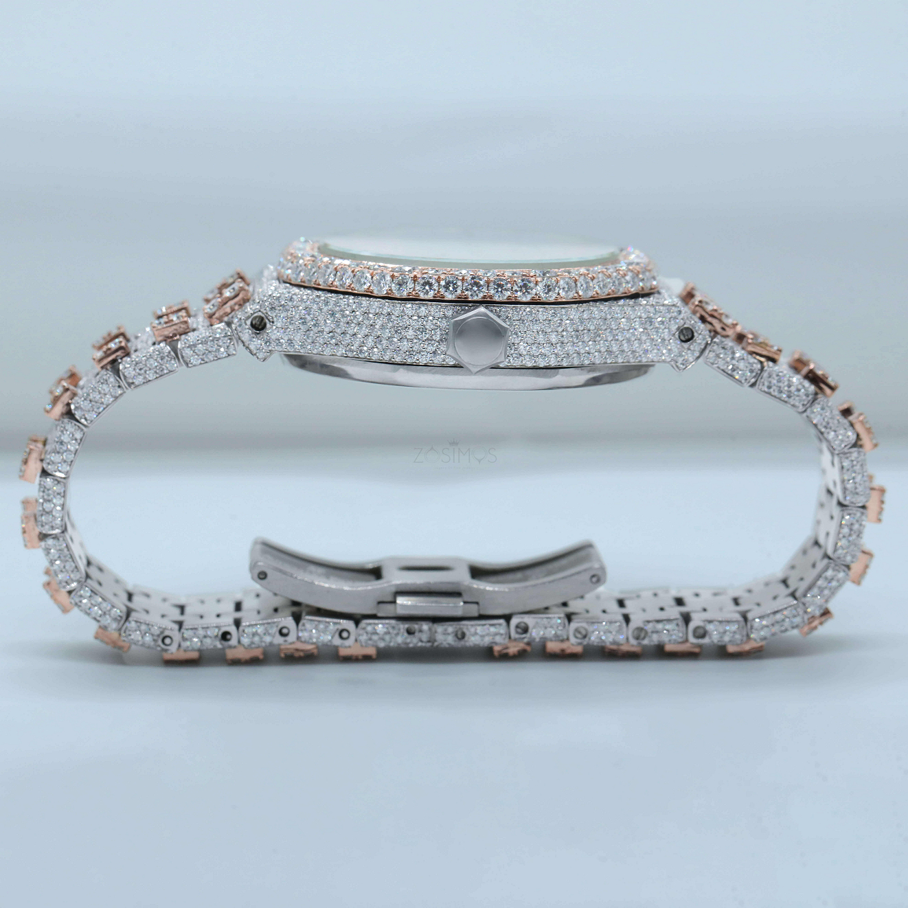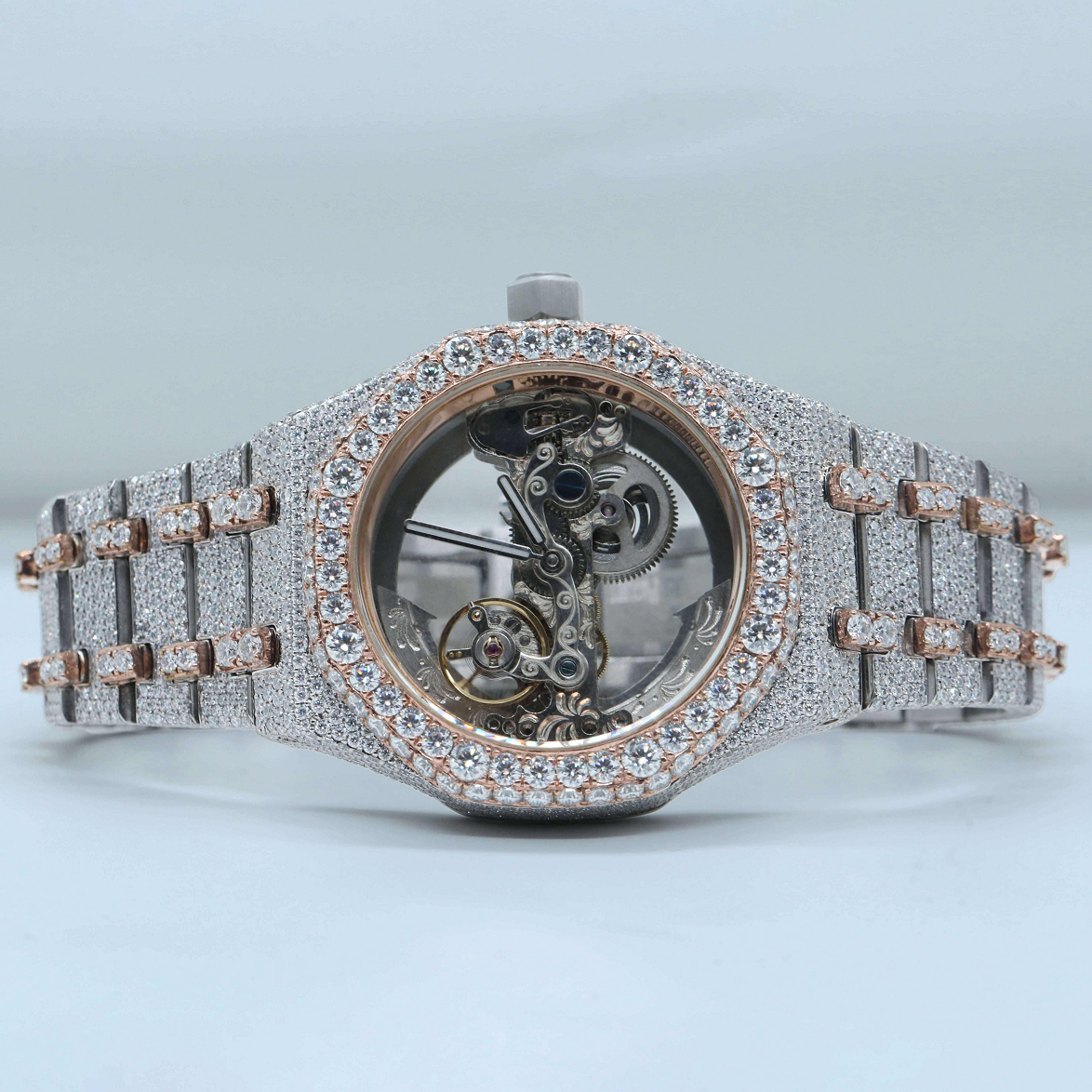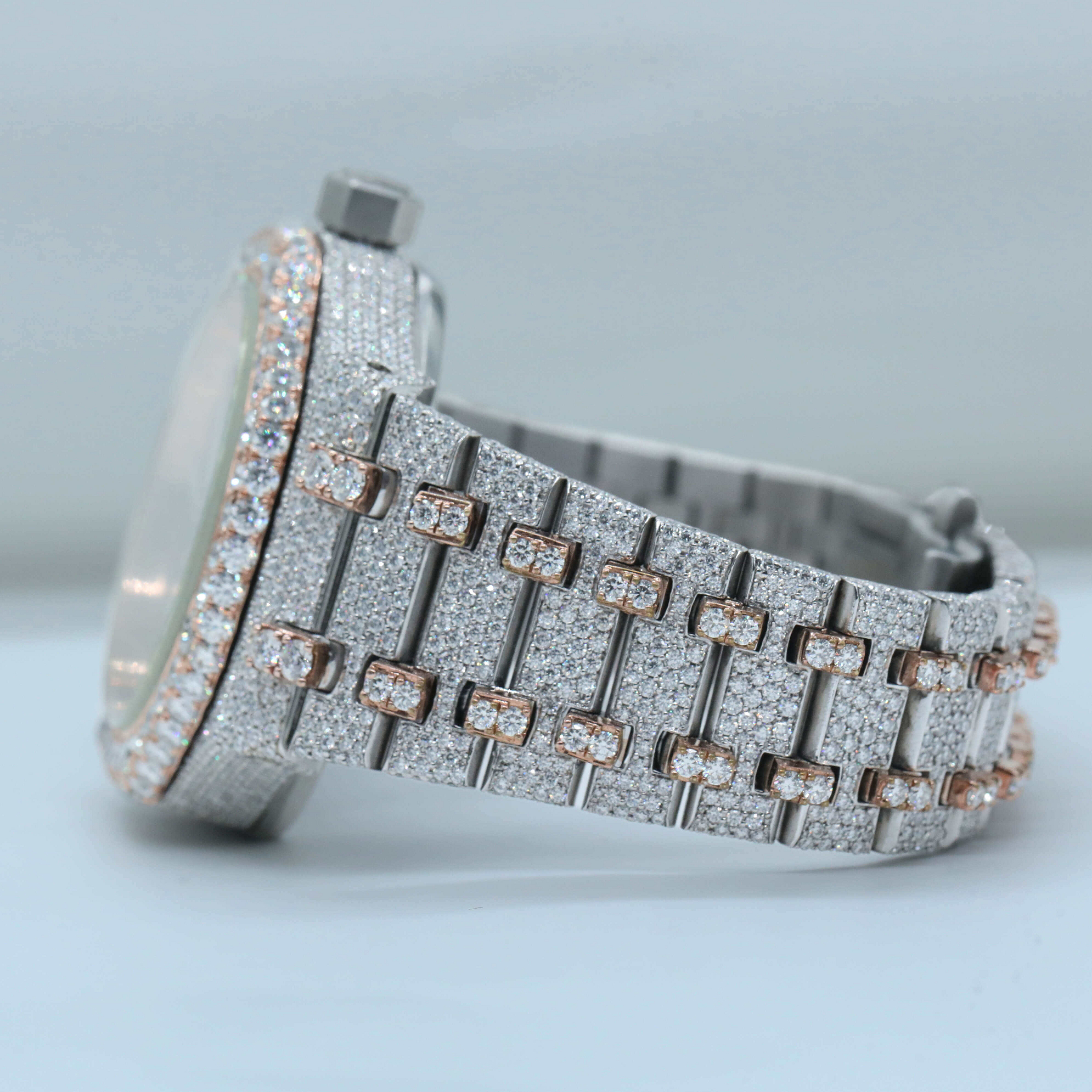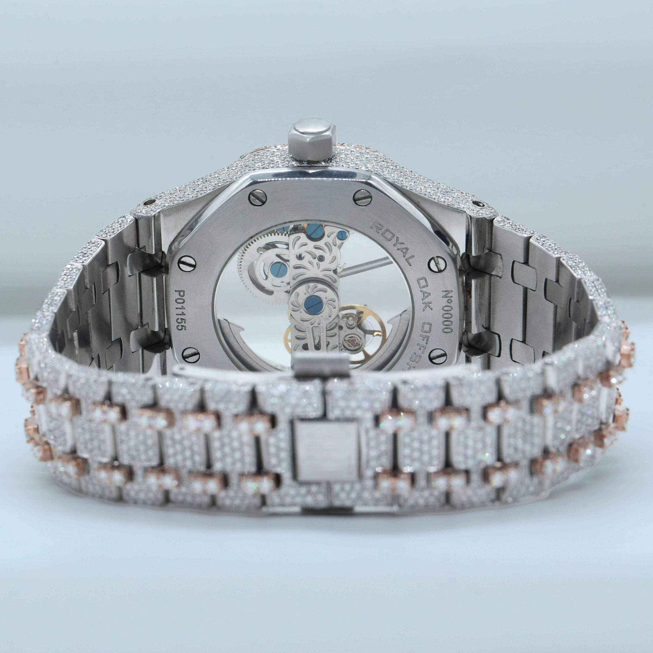 Elevate your style with the ultimate statement of sophistication and brilliance. This luxury timepiece is meticulously crafted and encrusted with premium moissanite gemstones, renowned for their dazzling fire and diamond-like sparkle. Each stone is hand-set to ensure maximum radiance, creating a watch that captures attention from every angle.