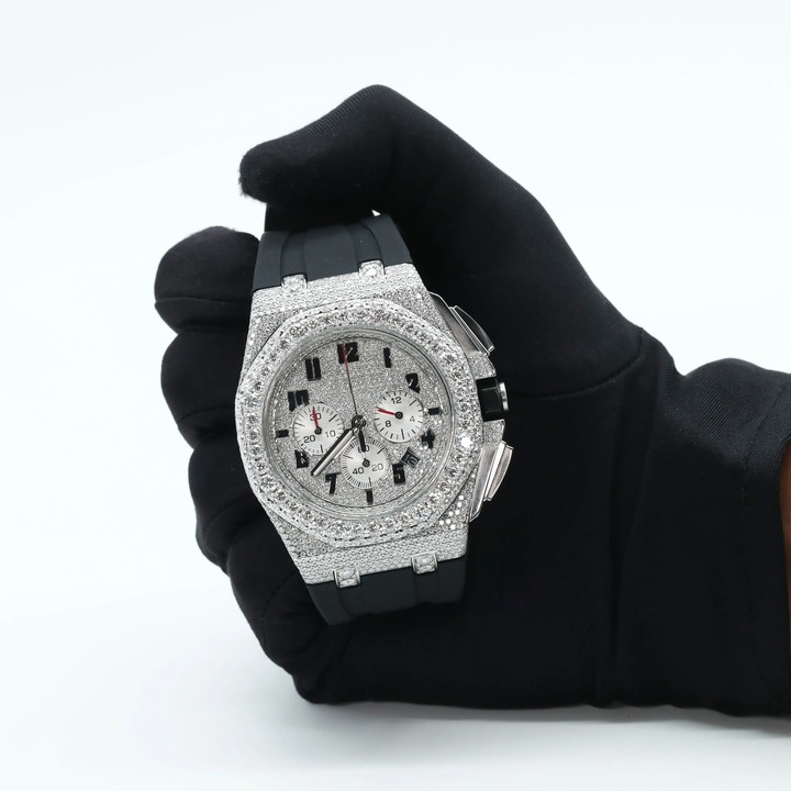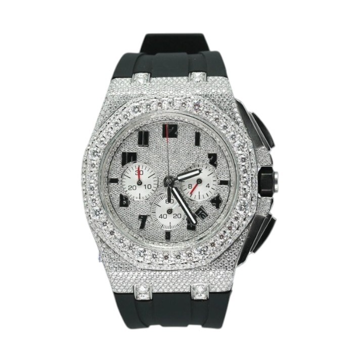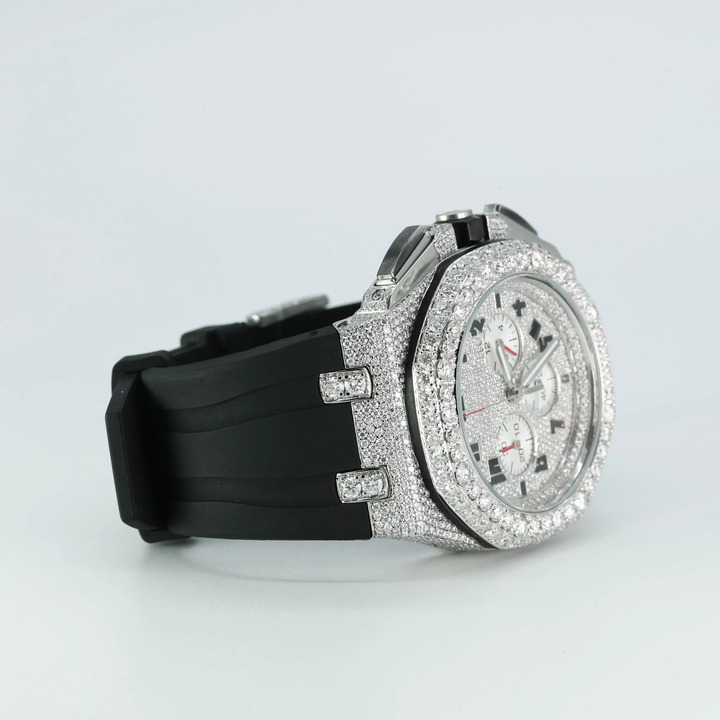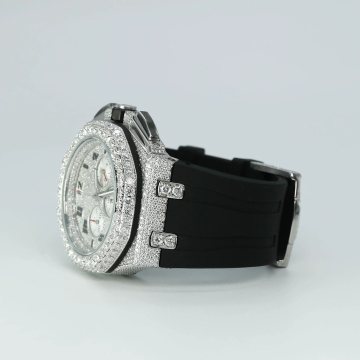 Elevate your style with the ultimate statement of sophistication and brilliance. This luxury timepiece is meticulously crafted and encrusted with premium moissanite gemstones, renowned for their dazzling fire and diamond-like sparkle. Each stone is hand-set to ensure maximum radiance, creating a watch that captures attention from every angle.
